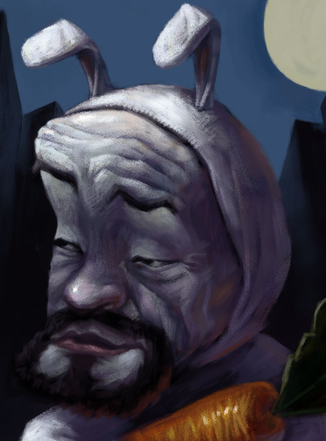 一个穿这兔子衣服的人~在晚上~抱着一根胡萝卜~~~独自站在街头~~~~